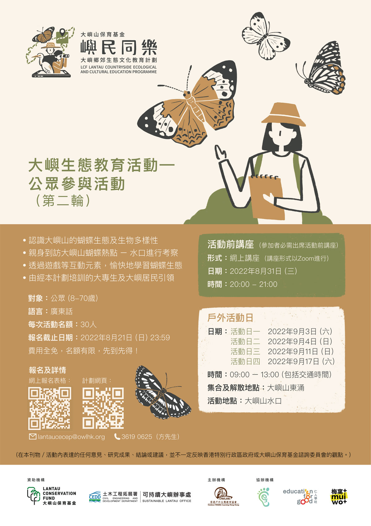 大屿生态教育活动—公众参与活动 (活动主题:大屿蝴蝶生态) 以大屿蝴蝶生态为主题,对象为一般公众。活动将先透过网上课堂,让参加者掌握香港及大屿山的生态及生物多样性。其后带参加者走出课室,亲身到访大屿山其中一个赏蝶热点 – 水口进行考察,并在经本计划培训的大专生及大屿居民引领下,在地亲身体验学习内容, 观察大屿蝴蝶生态,提升保育大屿的意识。