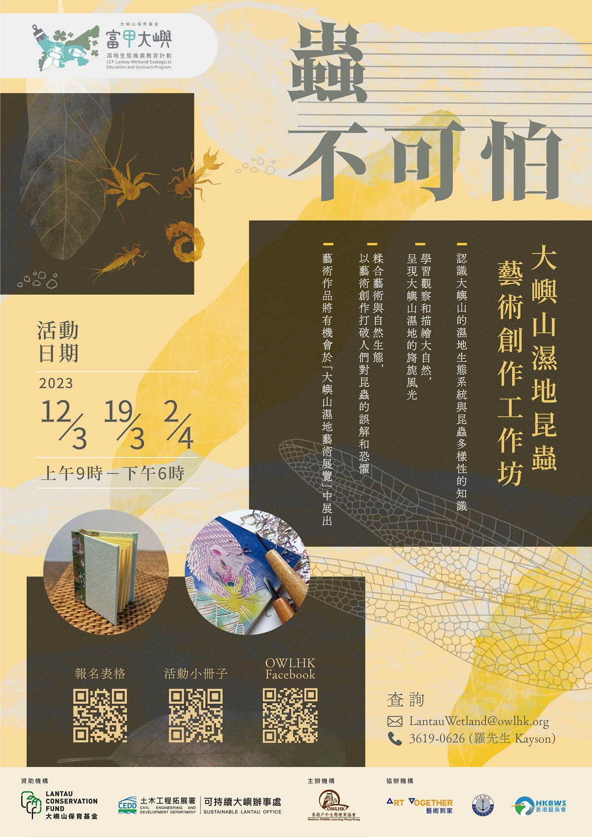 「虫不可怕—大屿山湿地昆虫艺术创作工作坊」伙拍本地专业艺术教育团体—「艺术到家」进行。活动先由湿地生态专家带领参加者,认识和观察大屿山湿地生态系统与昆虫多样性,再由艺术家带领及指导参加者完成艺术创作。参加者的艺术作品将有机会于「大屿山湿地艺术展览」中展出(预定于2024年下旬举行)。